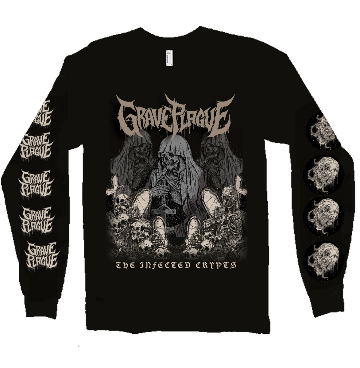 Printed on Gildan Ultra Cotton Tee. Logo and Design on front. Logo on sleeve & rotting skulls on other sleeve.